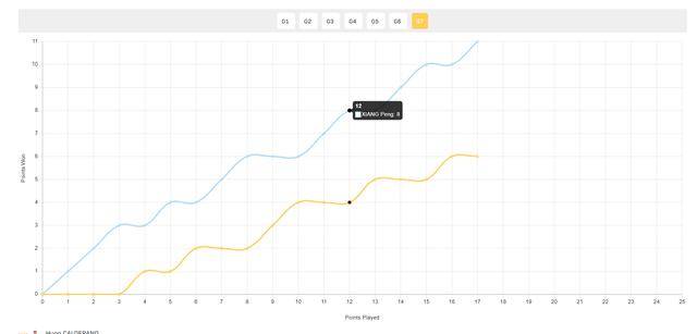 在第六局向鹏11-6扳平大比分后,决胜局向鹏开局打出3-0,随后6-2继续拉开分差,雨果追到5-8后向鹏连拿两分10-5拿到赛点,这时候雨果已经无力回天了,最终向鹏逆转取胜。