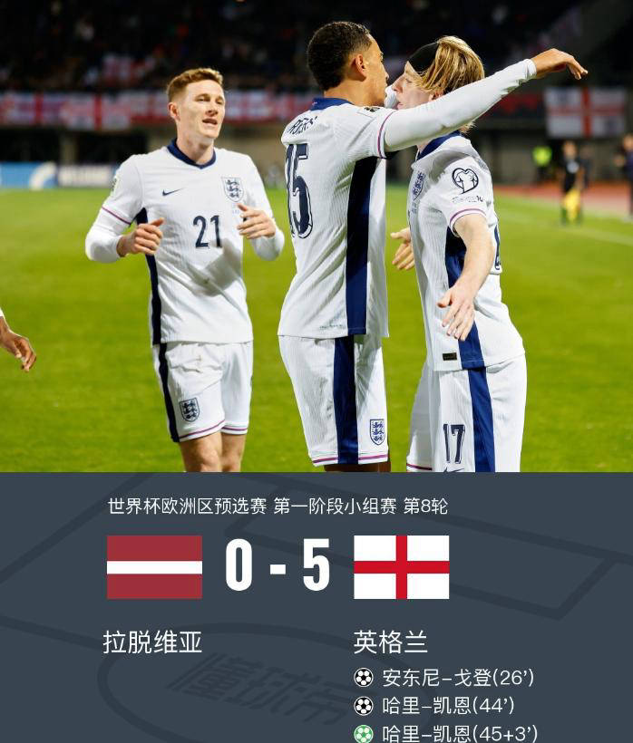 世界杯,2026世界杯,世界杯直播,世界杯投注,世界杯盘口,世界杯比分预测,聚焦2026年世界杯,提供最全面的赛程、直播、比分、投注推荐与爆冷预测信息。中文用户专属足球社区,助您精准分析,轻松购彩。2025年10月15日,雨雾弥漫的道加瓦球场未能阻挡英格兰队晋级的步伐。在世界杯欧洲区K组第8轮比赛中,英格兰队客场以5-0大胜拉脱维亚,以6连胜的出色战绩提前两轮锁定小组头名,成为欧洲区首支确保晋级2026年世界杯的球队。凯恩的进球表现再次引人注目,他在比赛中攻入两球,而戈登、埃泽也各自有精彩表现。球队控球率达到72%,完成24次高位转换,展现出索斯盖特战术体系的成熟和球队实力的强大。