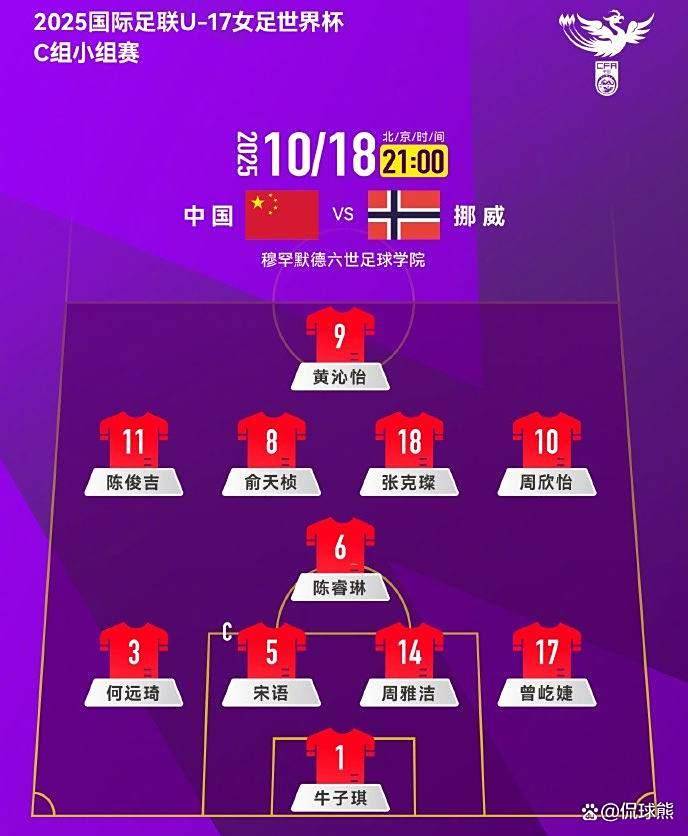 中国女足首发阵容: 门将牛子琪(1号),后卫何远琦(3号)、宋语(5号)、周雅洁(14号),中场陈睿琳(6号)、俞天桢(8号)、曾屹婕(17号)、张克璨(18号),以及前锋黄沁怡(9号)、周欣怡(10号)、陈俊吉(11号)。